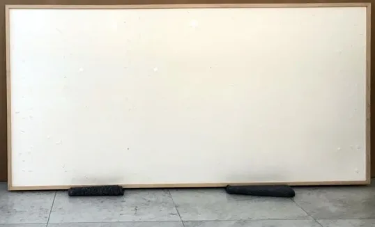 A obra consiste na delimitação de um espaço quadrangular de 1,5m por 1,5m, que pode ser demarcada onde o adquirente definir. Na visão conceitualista, segue a mesma lógica que serviu para a “Banana” de Cattelan, já tratada nesta coluna.