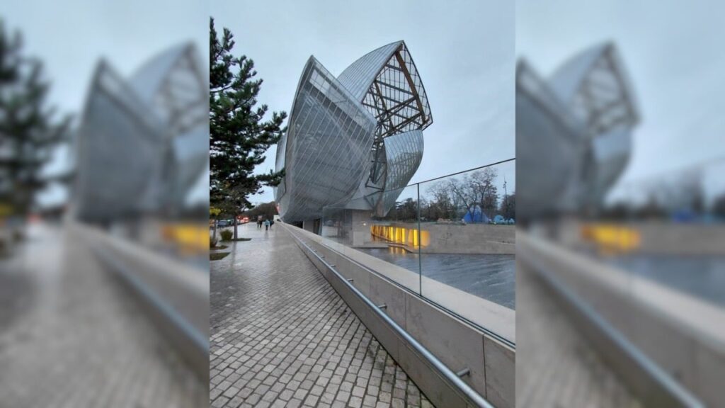 Por volta das 16h cheguei à Fundação Louis Vuitton. O prédio desenhado pelo arquiteto canadense-americano Frank Gehry se destacava como uma escultura de forma fluidas e espelhadas, parecendo um iceberg, ou melhor um navio ancorado em meio à paisagem que já escurecia. Logo na entrada, via-se uma cascata que se destacava, com degraus rasos, levemente inclinados, fazendo a água descer quase em câmara lenta. Era um ‘boas vindas’ em grande estilo.