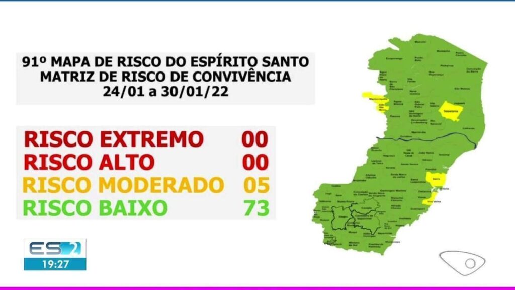 Diferente dos últimos mapas, em que todos os municípios capixabas estavam em risco baixo, nesta semana hácinco cidades em risco moderado:SerraeVila Velha, na Grande Vitória, eMantenópolis,Alto Rio NovoeSooretama, no interior capixaba.