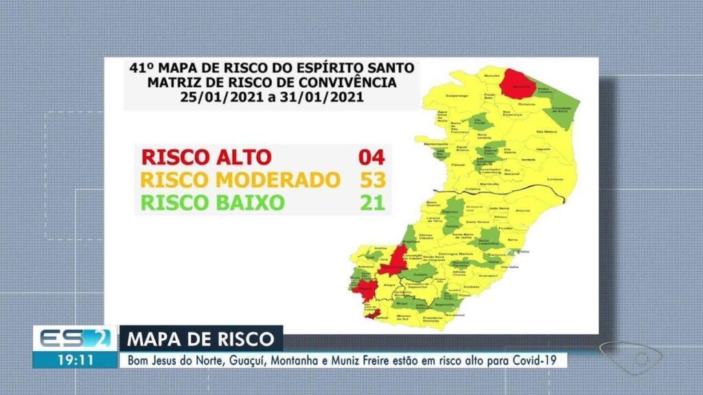 Os municípios em risco alto são Bom Jesus do Norte, Guaçuí, Montanha e Muniz Freire.Em relação ao mapa anterior,Bom Jesus do Norte e Guaçuí já estavam em risco alto e se mantiveram nesta classificação. Saíram do vermelho, as cidades de Anchieta, Apiacá, Conceição do Castelo, Iúna, Mimoso do Sul e São Mateus.