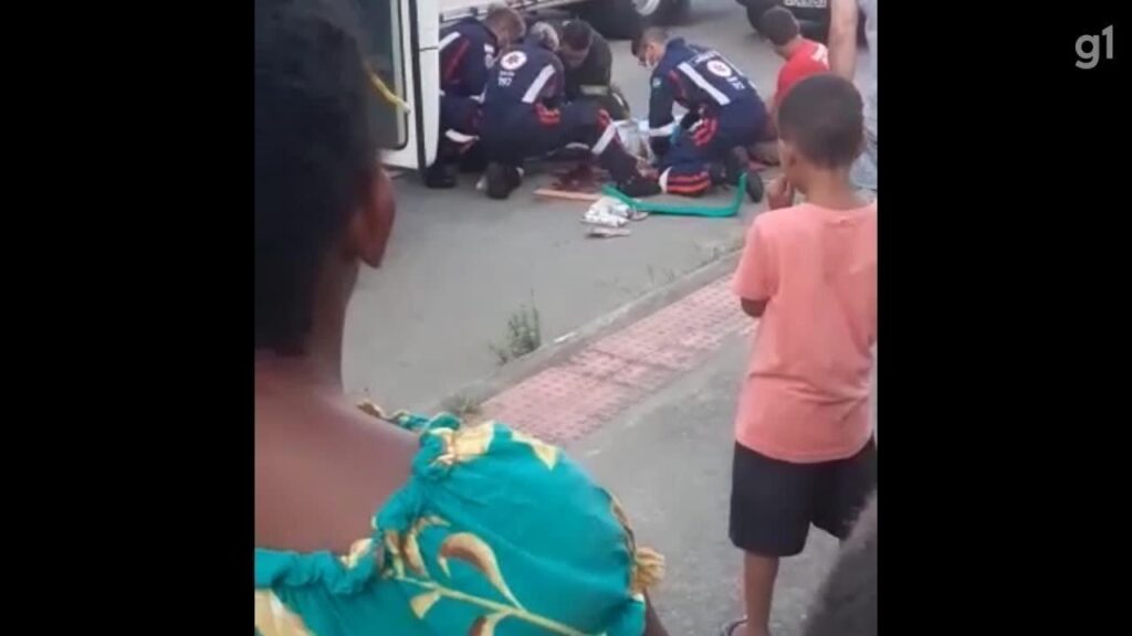 Um vídeo feito por moradores mostra o momento em que umamulher foi socorridapor uma equipe do Serviço de Atendimento Móvel de Urgência (Samu) após ser atropelada por um ônibus emGuarapari, na Grande Vitória, no final da tarde deste domingo (2).