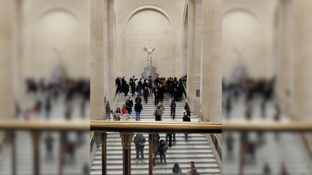 A Vitória de Samotrácia é a icônica escultura grega helenística do século II a.C., representando a deusa da vitória. Exibida majestosamente no alto de uma escadaria, ela pode ser vista de longe, e, quando chegamos perto, a seus pés, os visitantes se revezam para fazerem uma selfie com ela ao fundo.